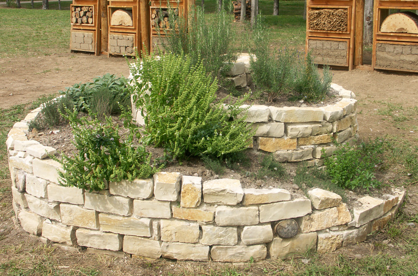 Sur le même principe, vous pouvez créer une spirale plantée de plantes mellifères et aromatiques. Celles-ci apporteront apporteront moins de zones de nidification pour les abeilles terricoles, mais elles fourniront pollen et nectar aux insectes butineurs (et éventuellement des herbes pour la cuisine).